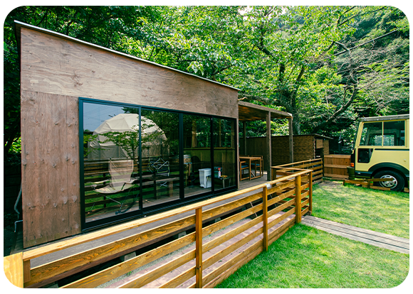 2棟の宿泊施設があり、焚き火スペースは貸切で1箇所のみになります。1日1組の予約のみになります。